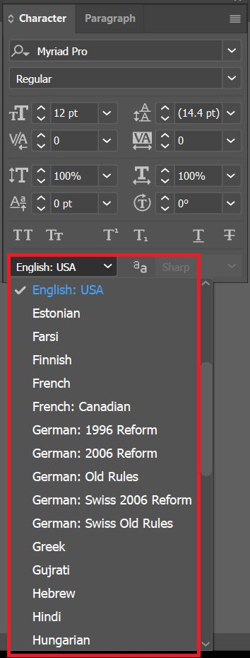 يمكنك تحديد خيار لغة ذات صلة في القائمة المنبثقة Language في جزء Character في لوحة Properties كما هو موضح أدناه. يستخدم هذا الخيار للتحقق من الواصلة والهجاء.