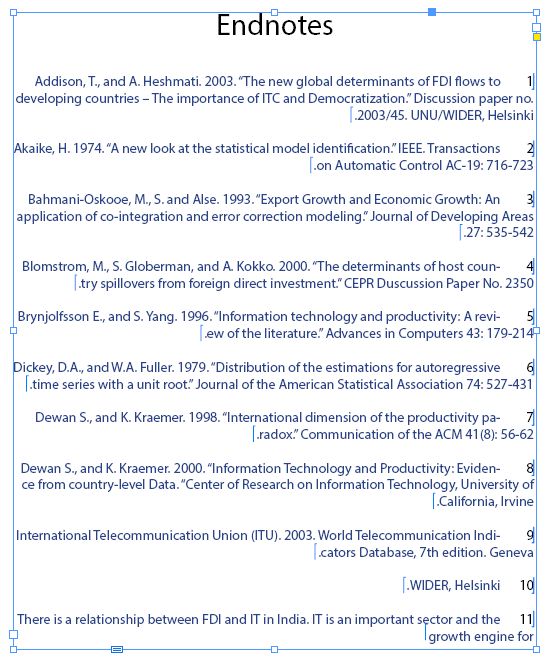 - إذا قمت بإزالة التداخلات وأنماط الحروف من الفقرة التي تحتوي على مبرز مرجع التعليق الختامي، فإن أرقام مراجع التعليقات الختامية تفقد الخصائص التي قمت بتطبيقها في مربع حوار Document Endnote Options.