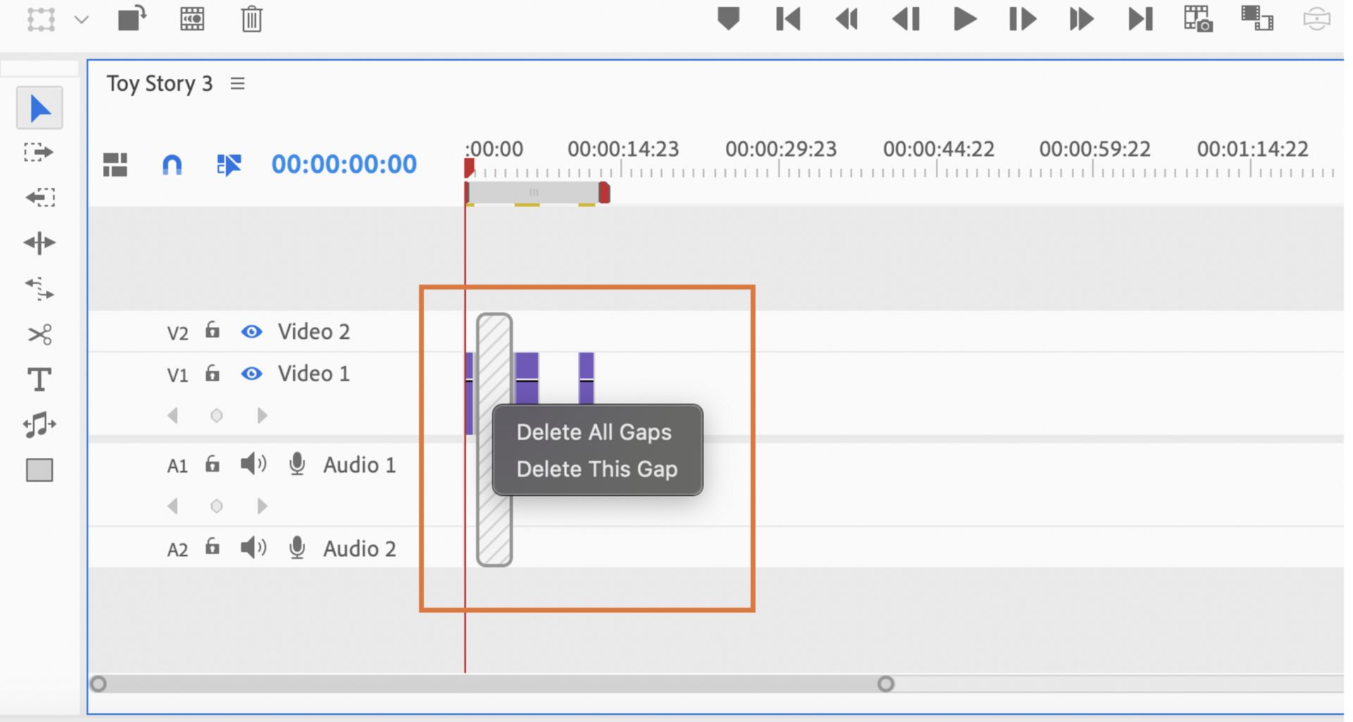 You can identify and remove gaps in the Timeline by hovering over the gap using: