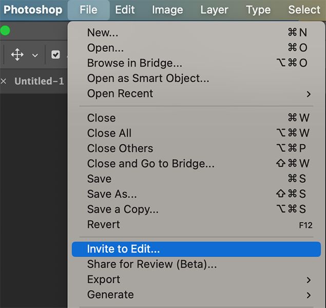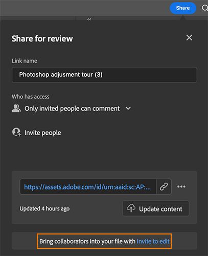 The Invite to edit feature allows you to invite others to edit your Photoshop cloud documents.
