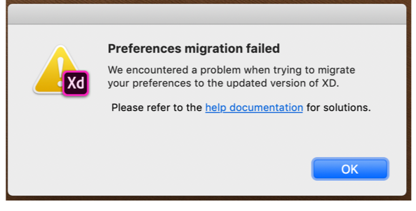 When updating XD, user preferences are automatically migrated. In some cases, due to permission issues, the preference migration fails in the backend and a notification appears.