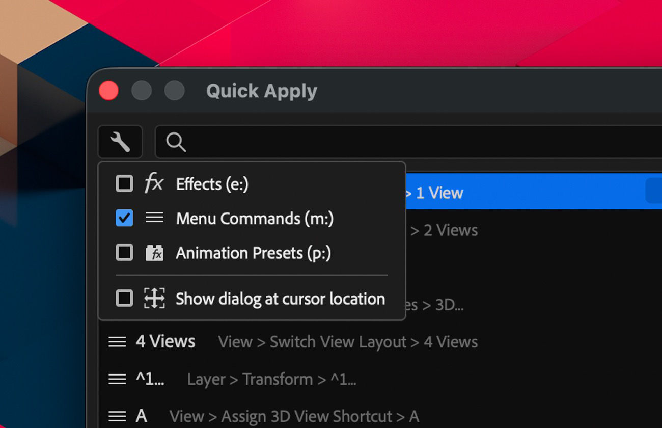 Quick Apply in the latest version of After Effects (Beta) is a simple search box that helps you quickly find any effect, animation preset, or menu command. Everything you need is in one place. Instead of clicking through multiple panels and menus, just type a few letters to see matching results right away. When you find what you’re looking for, select it and apply or run it instantly—whether you’re adding an effect to a layer, applying an animation preset, or choosing a menu command.
