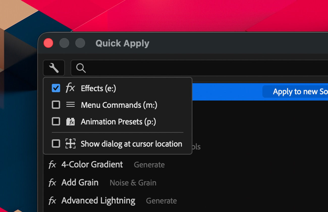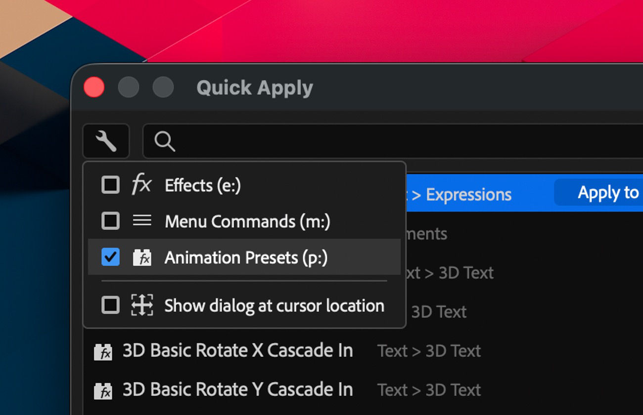 Quick Apply is now available for testing and feedback. Try it now in After Effects (beta).