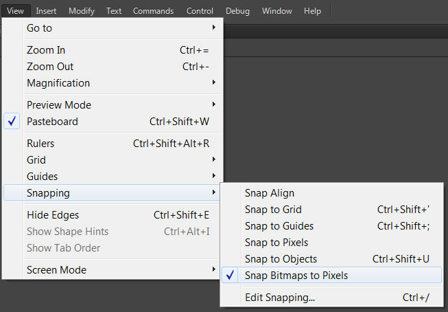 To enable bitmap snapping, use the Snap Bitmaps to Pixels command in the View menu. This ensures that bitmaps are placed in integer positions (without fractional values) when authoring content.