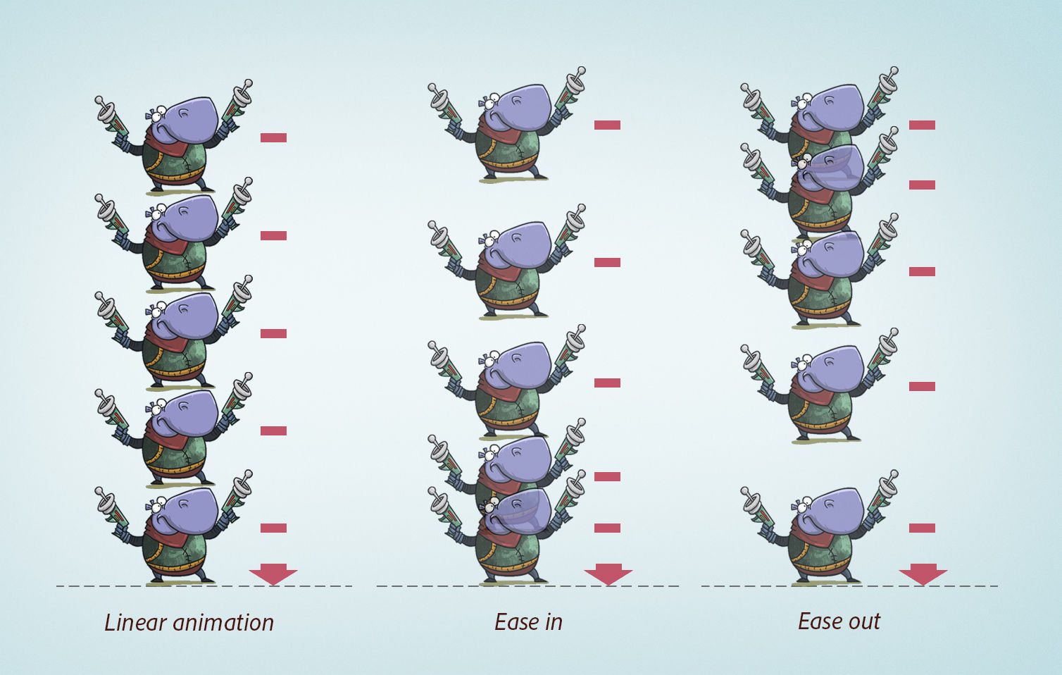 Easing is a technique for modifying the way that Adobe Animate calculates the property values in between property keyframes in a tween. Without easing set, Animate moves tweened objects at the same speed on each frame of the animation. With easing, you can adjust the speed of tweened objects to make movements appear more natural and to create complex animations.An ease is a mathematical curve that is applied to the property values of a tween.