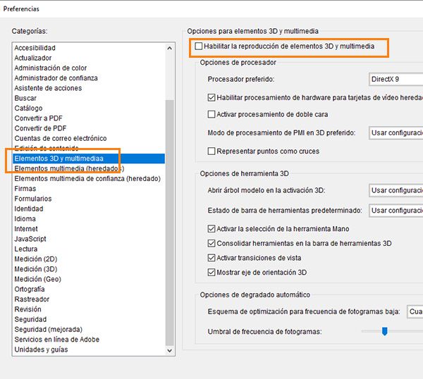 De forma predeterminada, el contenido 3D en archivos PDF se desactiva debido a posibles vulnerabilidades de seguridad. Para activar la reproducción de contenido 3D, seleccione la opción "Habilitar la reproducción de contenido 3D" en el panel Multimedia y 3D.