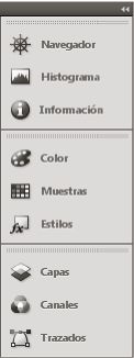 Para añadir un panel o un grupo de paneles flotantes a un conjunto acoplado de iconos, arrástrelo por su ficha o barra de título. (Los paneles se contraen automáticamente en iconos cuando se añaden a un conjunto acoplado de iconos).