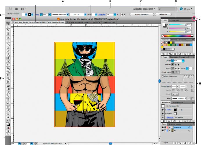 (Illustrator, Adobe InCopy®, Adobe InDesign®, Photoshop, Fireworks) Para ocultar o mostrar todos los paneles, incluidos el panel Herramientas y el panel de control, pulse Tabulador.