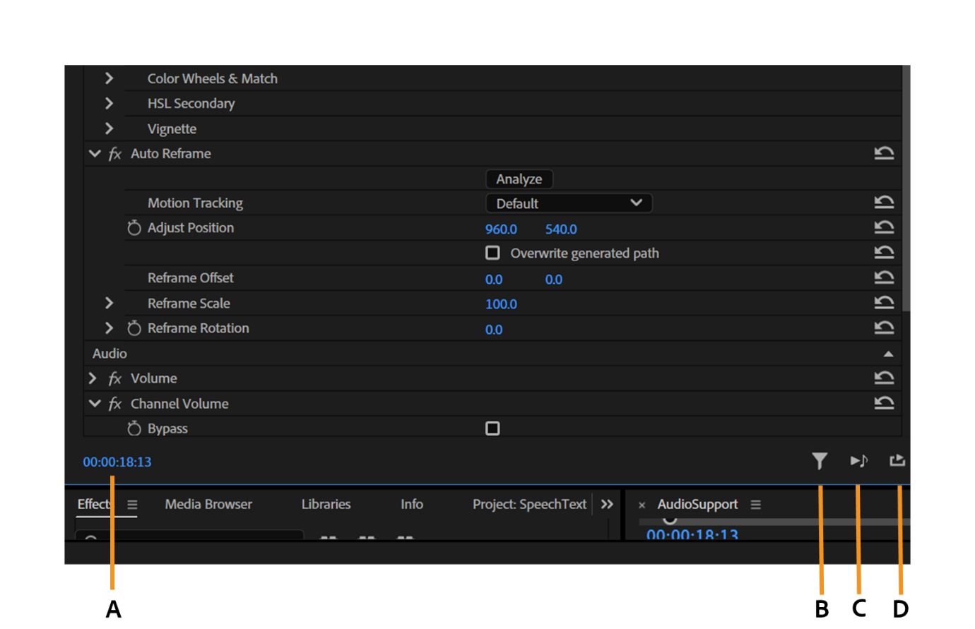 A. Tiempo actual B.Filtro de propiedades C.Reproducir solo el audio de este clip D. Conmutar reproducción de audio en bucle