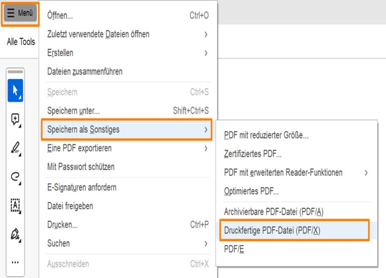 Öffne die PDF-Datei in Acrobat und wähle das Hamburger-Menü (Windows) oder das Menü Datei (macOS) > Speichern als Sonstiges > Druckfertige PDF-Datei (PDF/X).