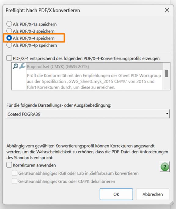 Hinweis:Du kannst die verfügbaren PDF/X-4-Konvertierungsprofile auswählen, die im Bereich PDF/X-4 entsprechend dem folgenden PDF/X-4-Konvertierungsprofil erstellen aufgelistet sind, und bei Bedarf Korrekturen anwenden wählen.