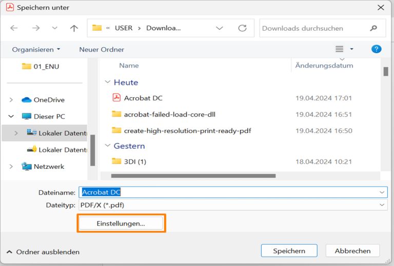 Wähle im Dialogfeld Speichern unter die Option Einstellungen.