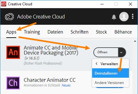 Verwenden Sie die Creative Cloud Desktop-Applikation, um Animate neu zu installieren.