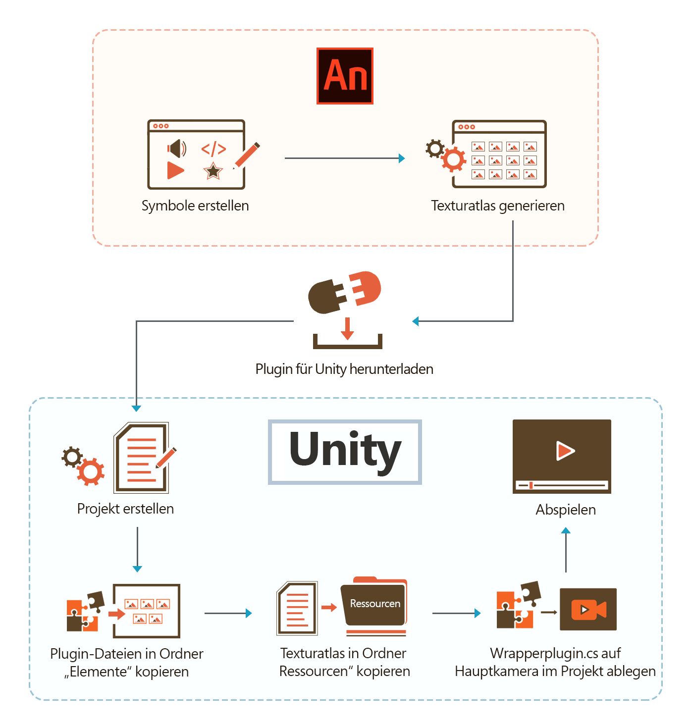 Das Generieren eines Texturatlasses in Animate und das Importieren in Unity werden im folgenden Diagramm dargestellt: