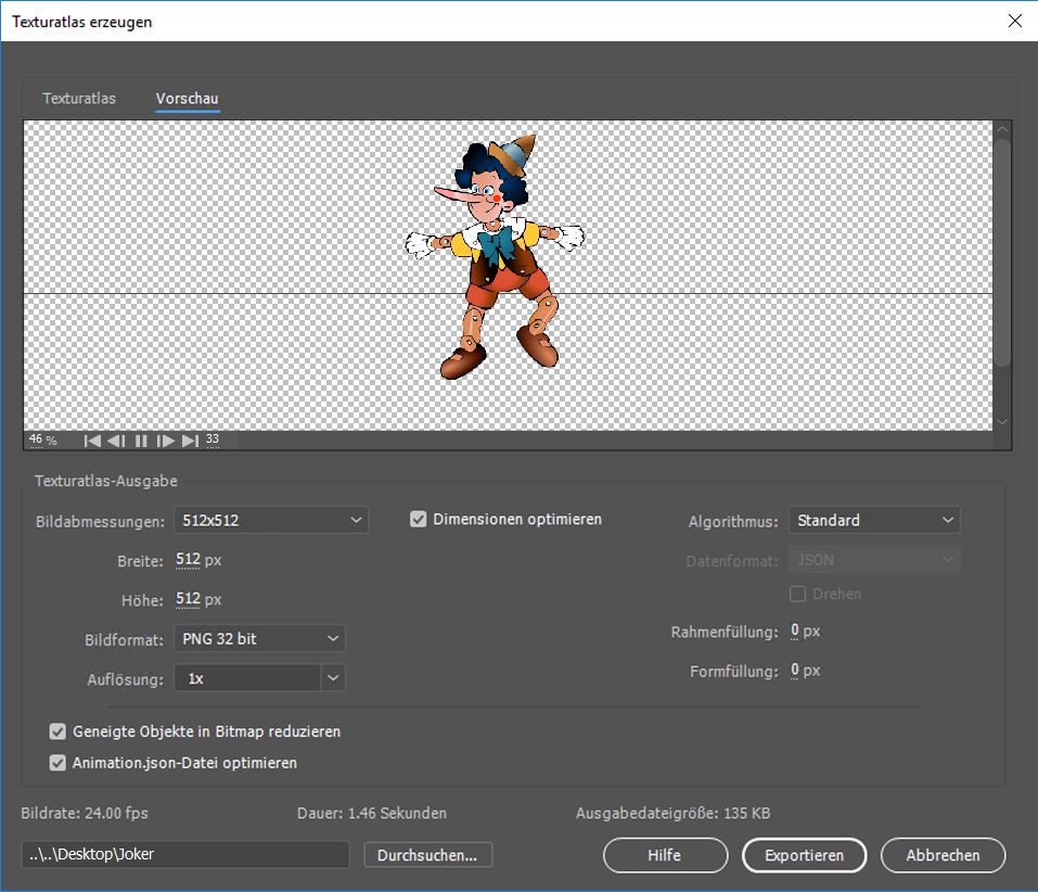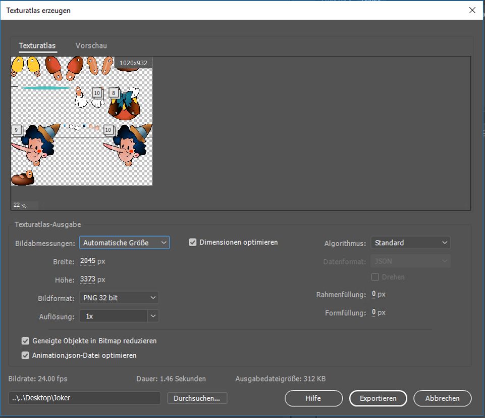 Um den Texturatlas für die Animation zu generieren, führen Sie die folgenden Schritte aus: