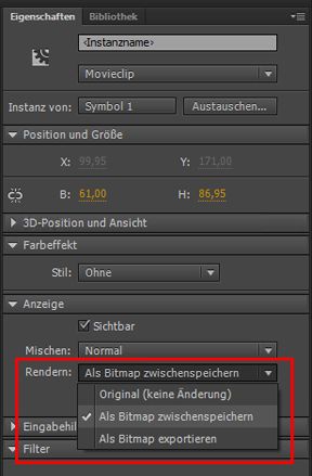 Zum Aktivieren der Eigenschaft Als Bitmap zwischenspeichern zu einem MovieClip-Symbol wählen Sie die MovieClip-Instanz und anschließend „Als Bitmap zwischenspeichern“ im Dropdown-Menü „Rendern“ im Eigenschafteninspektor (Fenster > Eigenschaften).