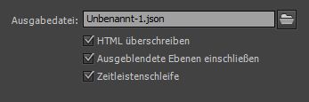 Schließt alle ausgeblendeten Ebenen in die WebGL-Ausgabe ein. Wenn Sie die Option „Ausgeblendete Ebenen einschließen“ deaktivieren, wird keine der ausgeblendeten Ebenen (einschließlich der in Filmclips verschachtelten Ebenen), die als ausgeblendet markiert ist, in die WebGL-Datei exportiert. Auf diese Weise können Sie problemlos Versionen von WebGL-Dokumenten testen, indem Sie Ebenen ausblenden.