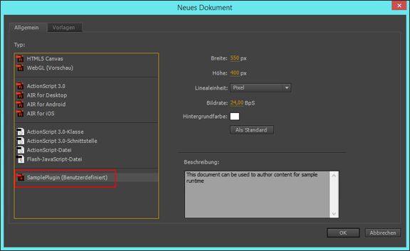 Nach der Installation fügt das Plug-in einen neuen Dokumenttyp zu Animate hinzu. Sie können eine Reihe von Werkzeugen verwenden, die durch das Plug-in für die Plattform aktiviert wurden. Beim Veröffentlichen Ihrer Arbeit verwendet Animate die für die benutzerdefinierte Plattform konfigurierten Veröffentlichungseinstellungen.