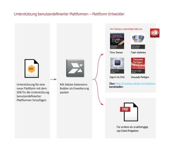 Die Unterstützung benutzerdefinierter Plattformen kann zu Animate hinzugefügt werden, indem ein Plug-in mit einer Reihe von APIs (Anwendungsprogrammierschnittstellen) implementiert wird, die als Teil des Entwicklungskits zur Unterstützung benutzerdefinierter Plattformen bereitgestellt werden. Entwickler können mithilfe dieser Schnittstellen Plug-ins zur Unterstützung benutzerdefinierter Plattformen für Animate erstellen und sich auf den Beispielcode beziehen. Durch Installieren eines Plug-ins zur Plattformunterstützung für einen neuen Dokumenttyp können Benutzer Grafiken mit den umfangreichen Funktionen von Animate erstellen und sie im Ausgabeformat der benutzerdefinierten Plattform veröffentlichen.