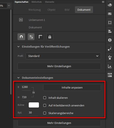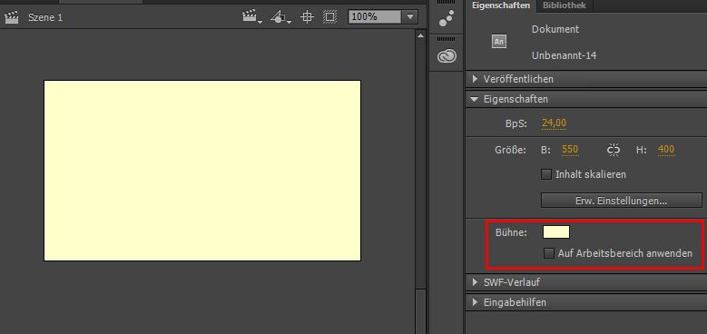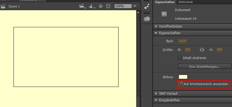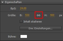 Aktivieren Sie hingegen die Option „Inhalt skalieren“, so werden die Bühnenabmessungen automatisch verknüpft und die Eigenschaften „Höhe“ und „Breite“ werden deaktiviert. Schließlich ist bei einer Inhaltsskalierung die proportionale Änderung der Bühnenabmessungen auf jeden Fall sinnvoll.