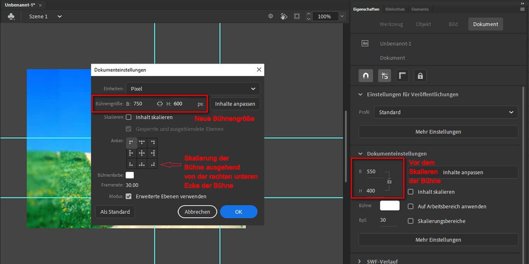 Im folgenden Beispiel wird die Bühne mit den Abmessungen 550 x 400, ausgehend vom Ankerpunkt in der rechten unteren Ecke der Bühne proportional auf 750 x 600 skaliert.
