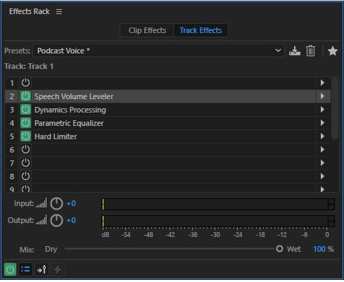 Um weitere vorkonfigurierte Effekte für Podcasts hinzuzufügen, wählen Sie im Dropdownfeld „Vorgaben“ die Option „Podcast-Stimme“. Die folgenden Effekte werden der Spur hinzugefügt: