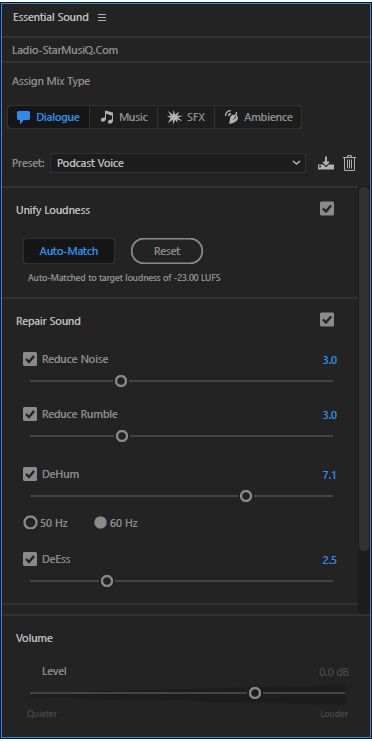 Wählen Sie in der Dropdownliste Anpassen an einen Lautstärke-Standard aus, der Ihren regionalen Standards und Ihrem Inhalt entspricht. Wählen Sie für Ihren Podcast die ITU-Übertragungsstandard-Vorgabe, durch die die Ziellautstärke auf –18 LUFS eingestellt wird.