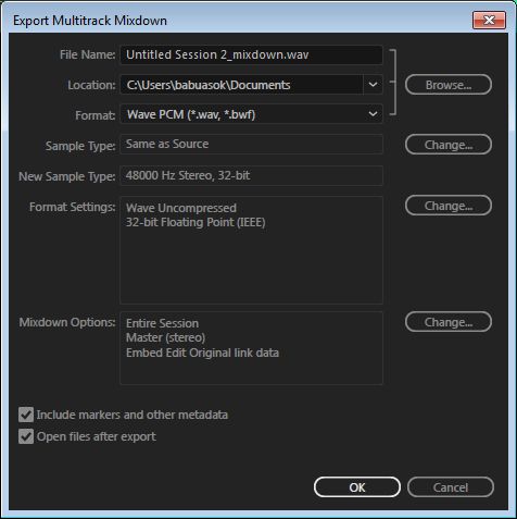 Um mit Audition zu exportieren, wählen Sie Ihr Format, den Sampletyp, die Formateinstellungen und die Abmischungsoptionen, indem Sie im Dialogfeld „Mehrspurabmischung exportieren“ oder „Speichern unter“ auf die Schaltfläche „Ändern“ klicken.