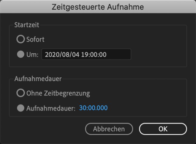 Positionieren Sie den Abspielkopf an der Stelle, an der Sie mit der Aufnahme beginnen möchten, und drücken Sie auf „Aufnehmen“. Das Dialogfeld Zeitgesteuerte Aufnahme wird angezeigt. - Startzeit: Sie können Uhrzeit und Datum des Beginns der Aufnahme ändern. Standardmäßig wird die Startzeit  auf 15 Minuten nach dem Zeitpunkt festgelegt, zu dem sie aufgerufen wurde. Sie können die Aufnahme sofort beginnen, indem Sie Sofort auswählen.