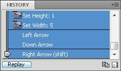 Bestimmte Mausaktionen wie das Auswählen durch Klicken im Dokumentfenster können nicht wiederholt oder gespeichert werden. Wenn Sie eine solche Mausaktion ausführen, wird im Bedienfeld „Verlauf“ eine schwarze Linie angezeigt (die erst sichtbar wird, wenn Sie eine andere Aktion ausführen). Um dies zu vermeiden, verwenden Sie die Pfeiltasten anstelle der Maus, um die Einfügemarke im Dokumentfenster zu verschieben.