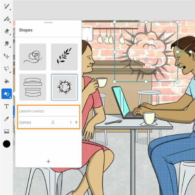 Hier erfahren Sie, wie Sie einfache und Adobe Capture-Formen aus Creative Cloud-Bibliotheken Ihren Grafiken in Fresco hinzufügen.