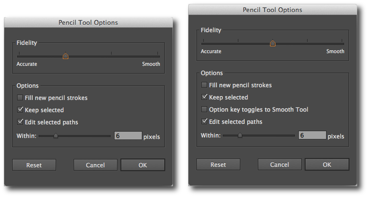 Der Regler Genauigkeit hat ab Illustrator CC 2014 5 Vorgaben. Eine neue Reglervorgabe (die genaueste Vorgabe) wurde hinzugefügt, mit der Sie die genauesten Pfade zeichnen können. Andere Dialogfelder mit der zusätzlichen Vorgabe sind die Dialogfelder der Glätten-, Pinsel- und Tropfenpinsel-Werkzeuge.