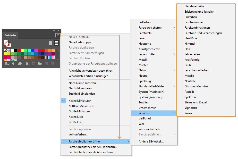 Erstelle Verläufe direkt über „Weitere Optionen“ im Bedienfeld „Farbfelder“. Erstelle Verläufe direkt über „Weitere Optionen“ im Bedienfeld „Farbfelder“.