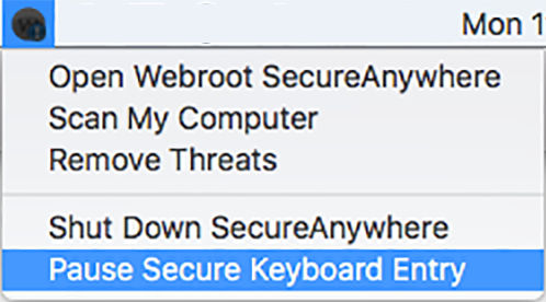 Dieses Problem tritt aufgrund der Einstellung Sichere Tastatureingabe in macOS auf, die durch einige Software von Drittanbietern, wie z. B. Webroot, aktiviert wird.
