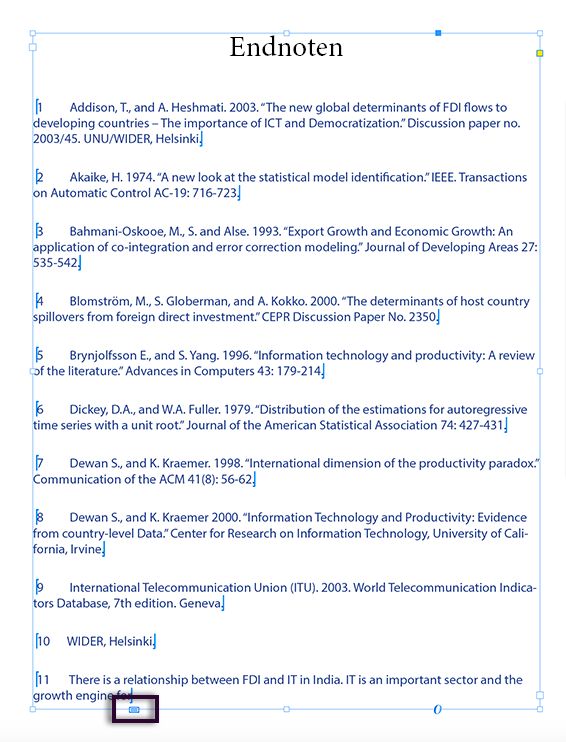 • Klicken Sie auf das Steuerelement in der unteren linken Ecke des Endnotenrahmens.