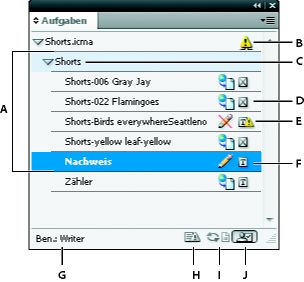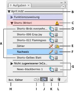 Das Hauptwerkzeug für die Arbeit mit Aufgaben ist das Aufgabenbedienfeld („Fenster“ > „Aufgaben“ in InCopy, „Fenster“ > „Redaktionelle Aufgaben“ > „Aufgaben“ in InDesign). Im Aufgabenbedienfeld werden die Dateien angezeigt, die mit dem derzeit aktiven InDesign-Dokument verknüpft sind. Ein Symbol zeigt dabei deren Status an. Das Menü des Aufgabenbedienfelds enthält zudem Befehle, mit denen sich die Funktionen für den Versionsimport und das Dateimanagement zwischen InCopy und InDesign koordinieren lassen. Wenn Sie eine Aufgabe in InCopy öffnen, werden der Name der Aufgabe und ihr Inhalt im Aufgabenbedienfeld angezeigt. Sie können auf Text- und Grafikrahmen im Aufgabenbedienfeld doppelklicken, um sie im Dokumentfenster auszuwählen.