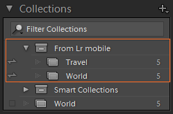 Bedienfeld „Sammlungen“ in Lightroom desktop; alle synchronisierten Sammlungen werden heruntergeladen unter dem Sammlungs-Set „Von Lightroom mobile“ im Bedienfeld „Sammlungen“. - Alle synchronisierten Sammlungen werden heruntergeladen unter dem Sammlungs-Set Von Lightroom mobile im Bedienfeld Sammlungen.