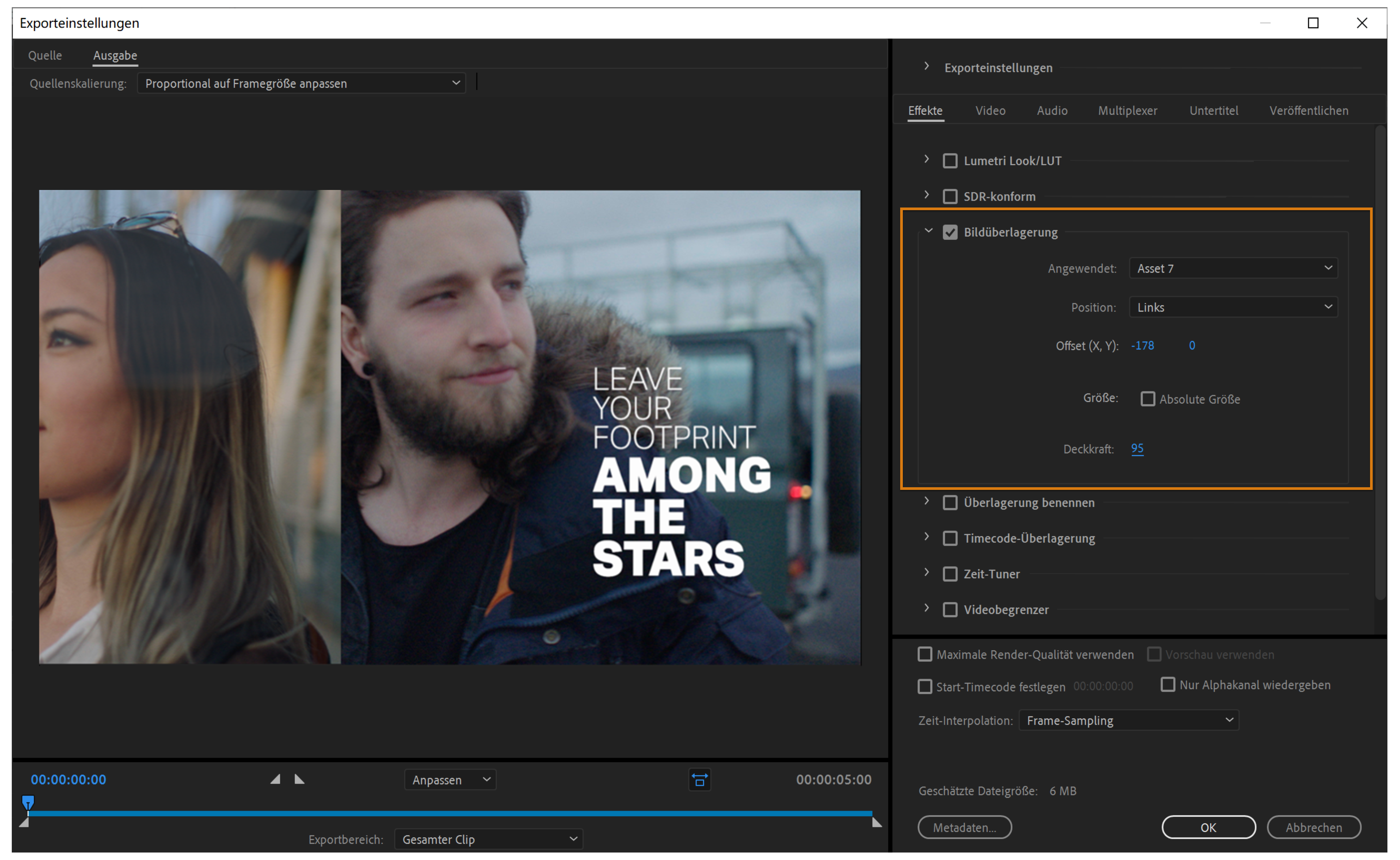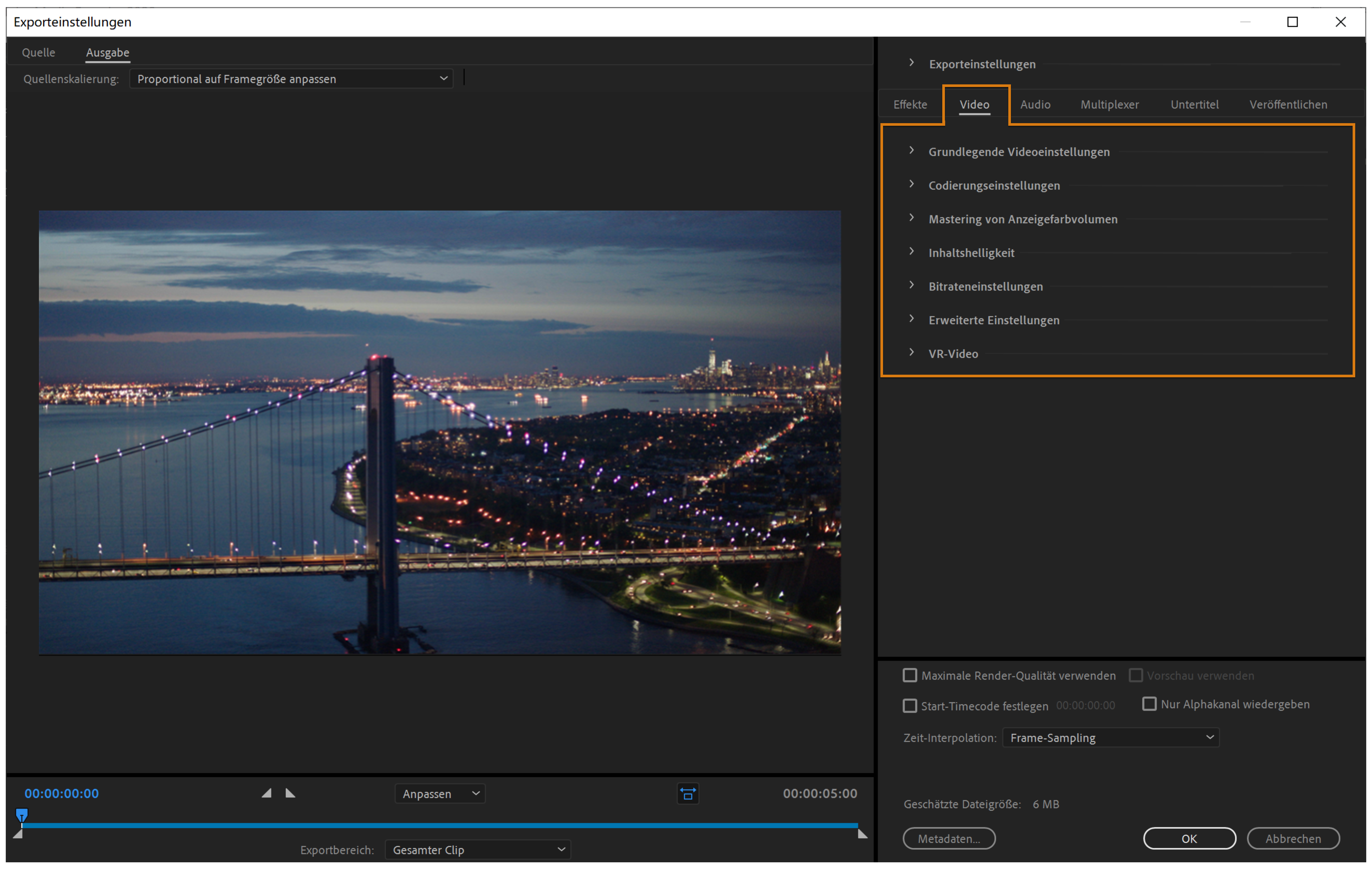 Die Registerkarte Ausgabe zeigt eine Vorschau der aktuellen Exporteinstellungen an, die auf das Quellvideo angewendet werden.