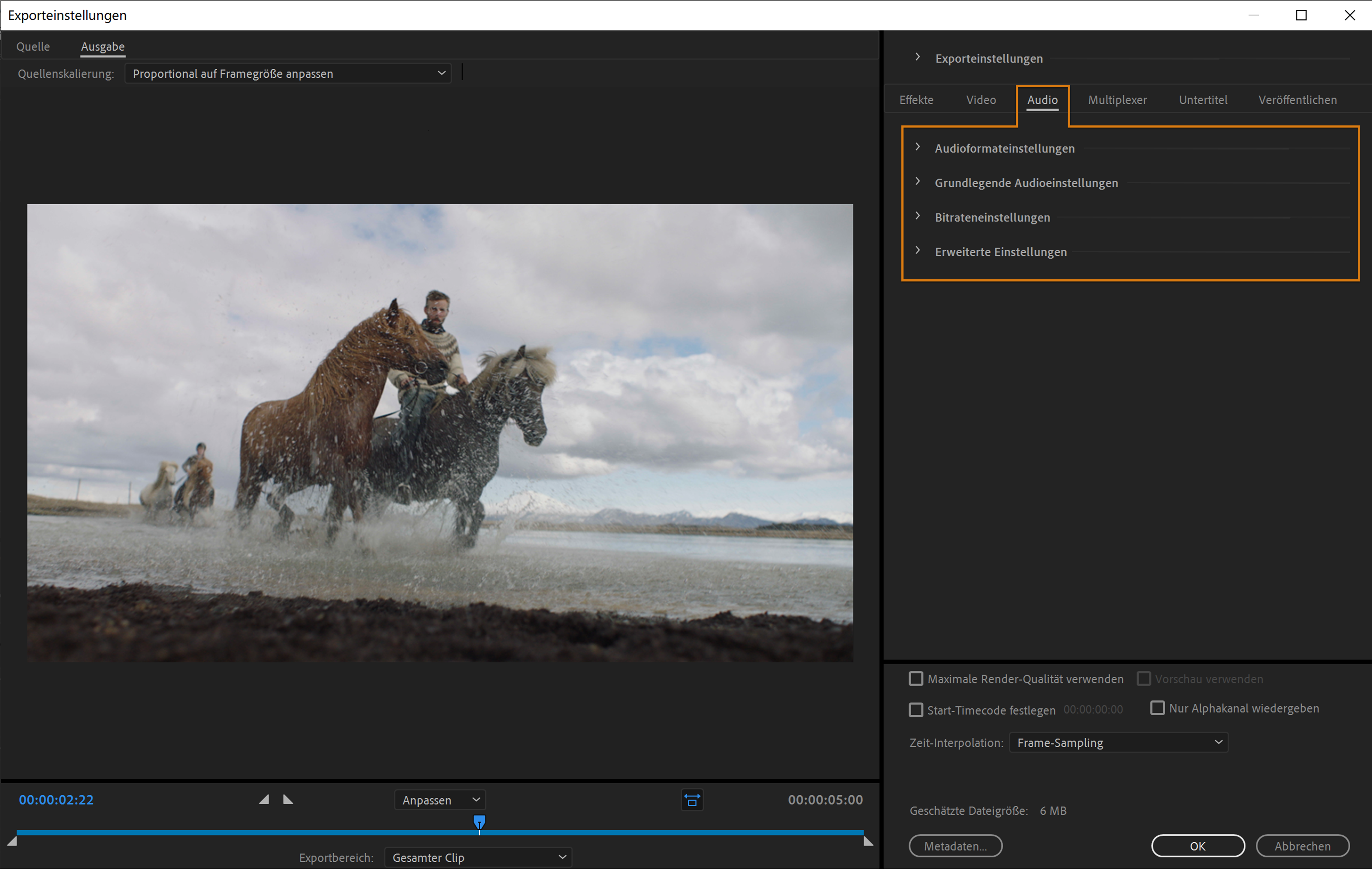 Audioeinstellungen finden Sie auf der Registerkarte „Audio“ des Dialogfelds Exporteinstellungen. Die Einstellungen weichen je nach ausgewähltem Exportformat ab.