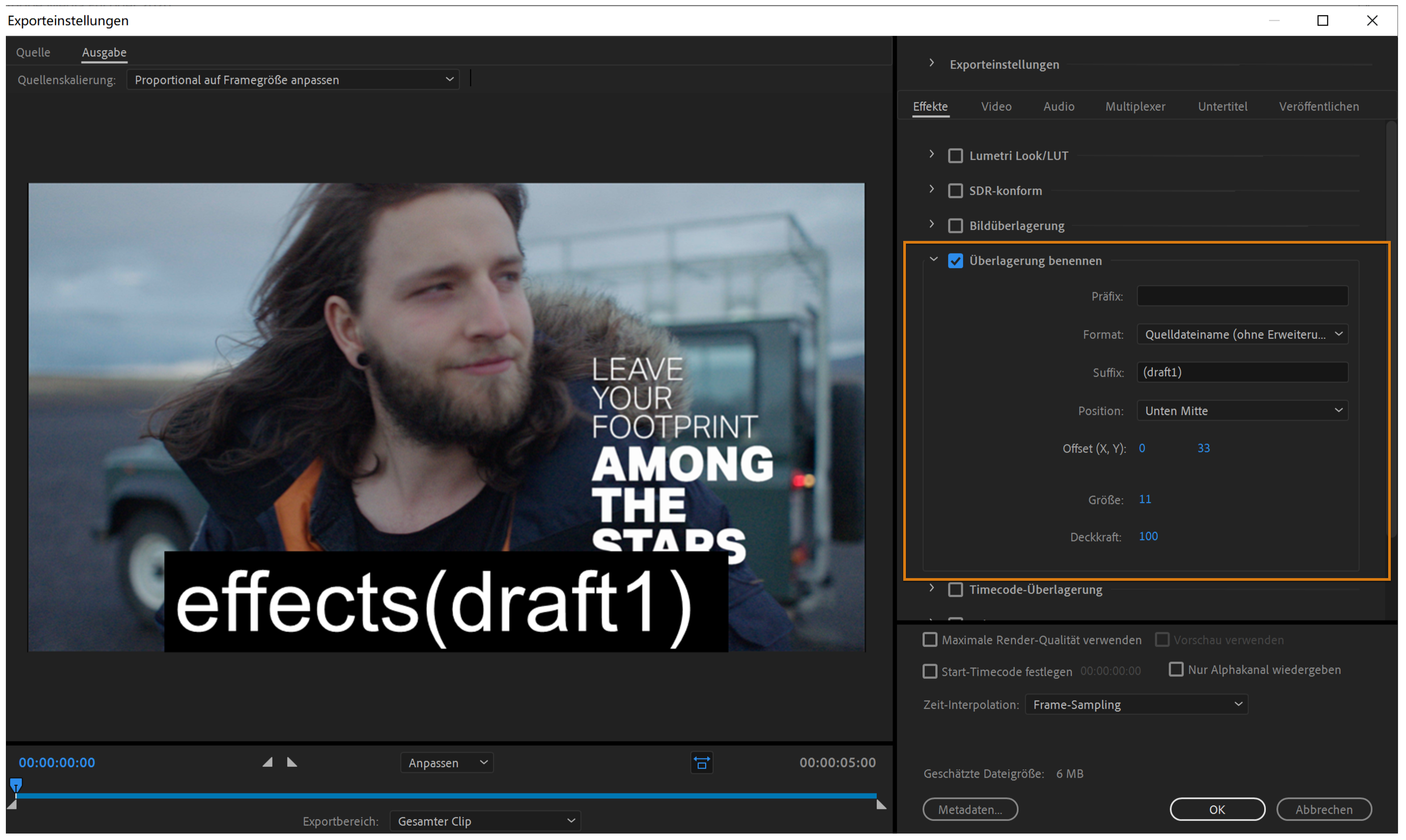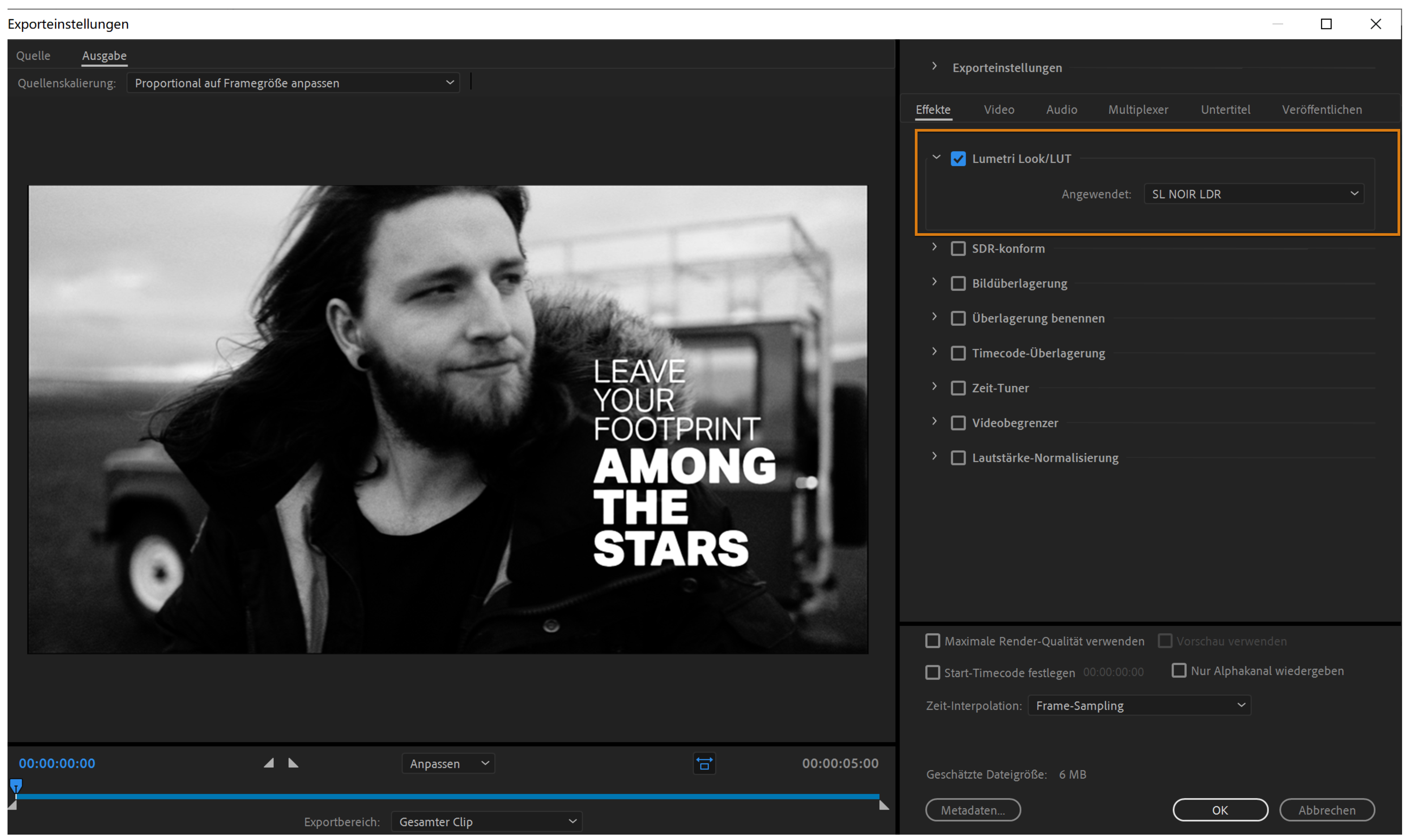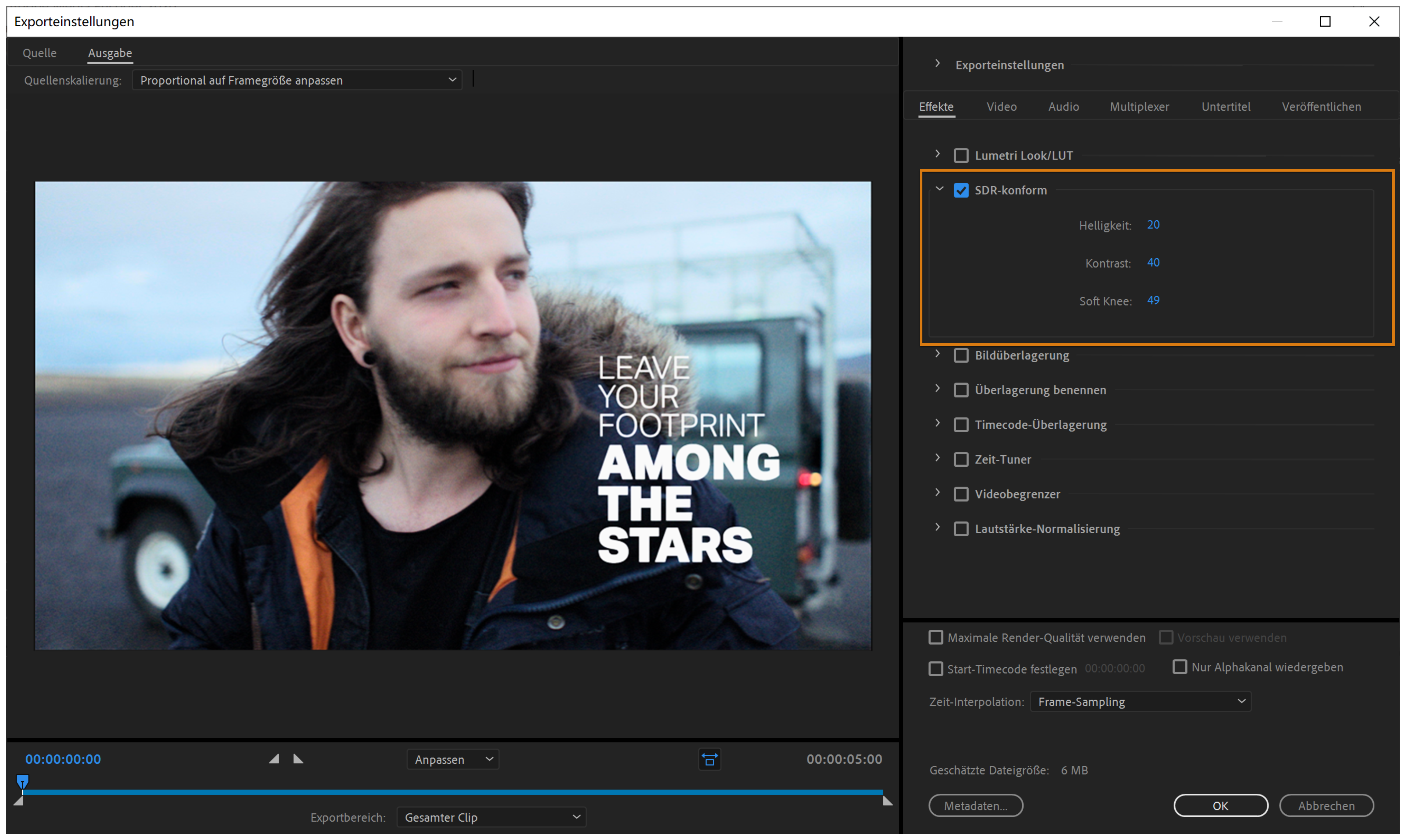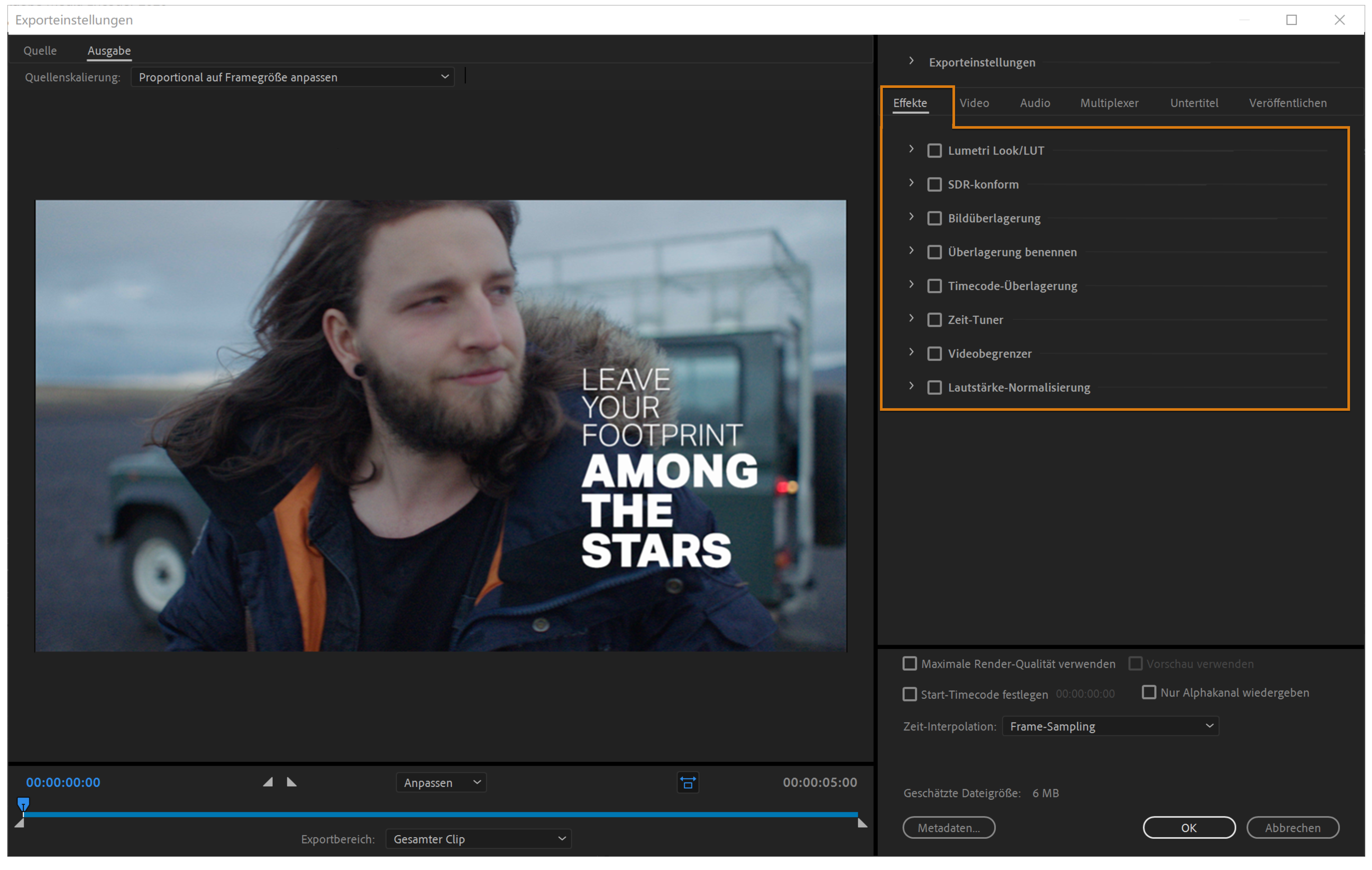Über die Registerkarte „Effekt“ können Sie verschiedene Effekte, wie z. B. Lumetri-Farbanpassungen, HDR-zu-SDR-Umwandlungen sowie Bild-, Text- und Timecode-Überlagerungen, zu exportierten Medien hinzufügen.