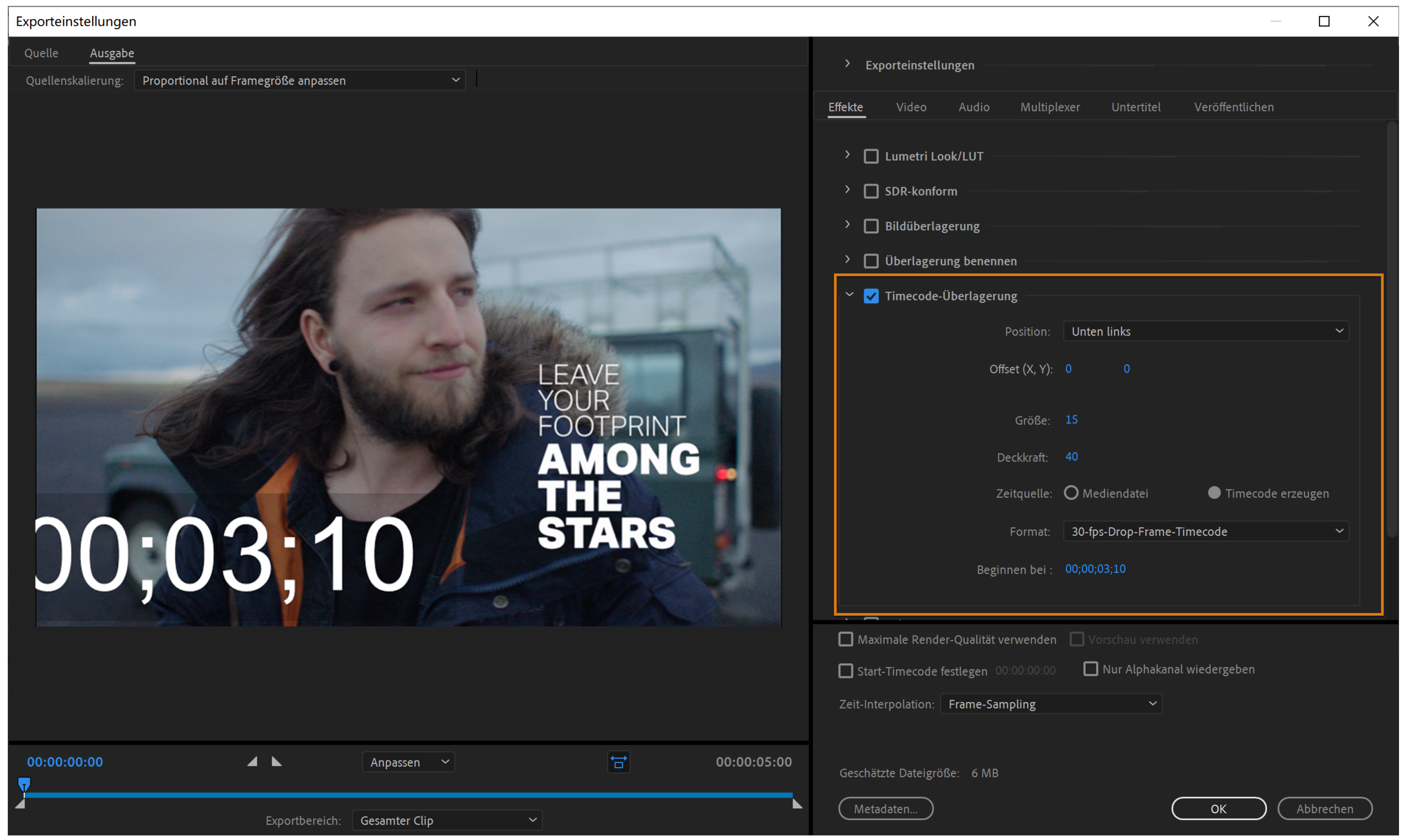 Adobe Media Encoder übernimmt die Zeitcode-Informationen aus einer Quelldatei. Über das Steuerelement „Start-Timecode festlegen“ können Sie den Startwert des Timecodes ändern. Wenn die Quelle bei 00:00:05:00 beginnt, beginnt die Zeitleiste für das Objekt in Adobe Media Encoder ebenfalls bei 00:00:05:00 und nicht bei null. Diese Zeitleisten-Informationen werden in die codierte Ausgabedatei übernommen.