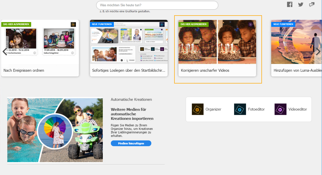 Wenn Sie Premiere Elements starten, finden Sie neue mit „Das hier ausprobieren“ gekennzeichnete Karten mit grünen Tags auf der Startseite. Mit diesen Karten können Sie neue Funktionen wie „Rausch reduzieren“, „Zeitraffer“, „Frame füllen“ und mehr in der Anwendung finden und weitere Informationen darüber erhalten.