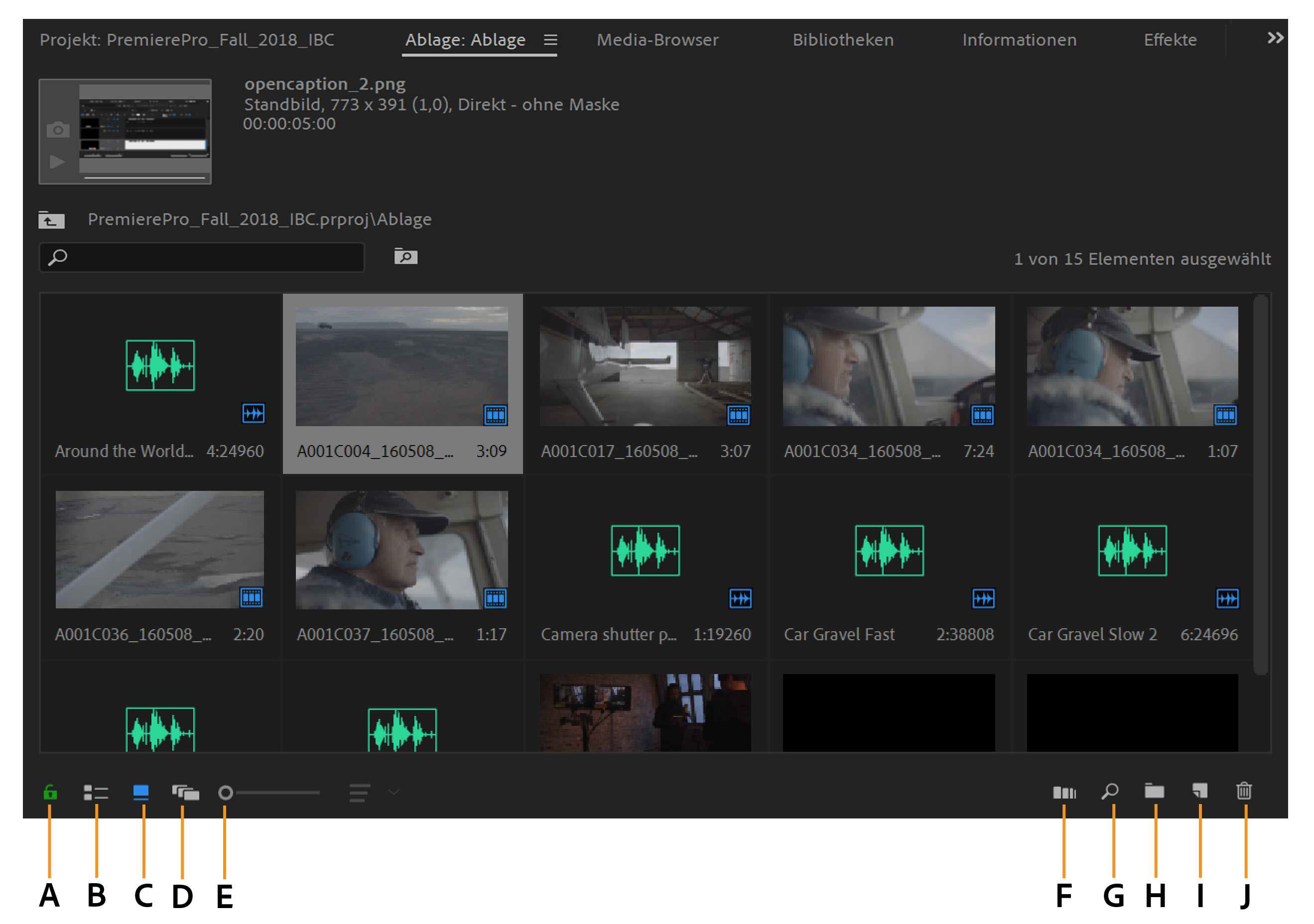 Nachdem Sie ein Asset erhalten haben, wird der entsprechende Name im Projektfenster angezeigt. Das Projektfenster enthält ausführliche Informationen zu allen Assets Ihres Projekts. Du kannst Medienelemente anhand einer der folgenden Ansichten im Bedienfeld Projekt anzeigen und sortieren: