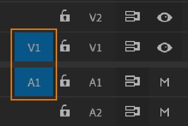 Mit der Zielführung für Spuren können Sie schnell durch das Schnittfenster navigieren. Verwenden Sie die Pfeiltasten nach oben und nach unten, um den Abspielkopf an den In-Points und Out-Points der Clips auf den Zielspuren zu platzieren. Sie können mehrere Spuren gleichzeitig als Ziel auswählen, sodass Sie die In-Points und Out-Points auf dem Schnittfenster ansteuern können.