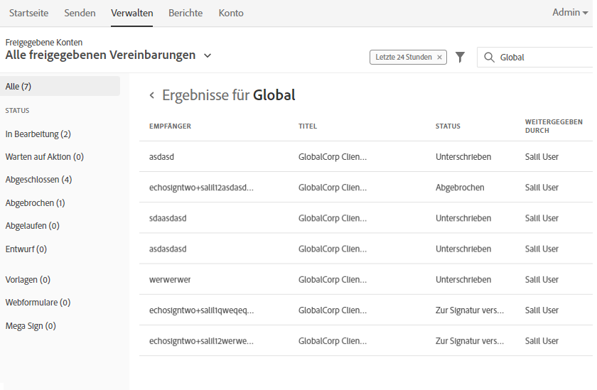 | Lösung: E-Mail-Parsing und Benutzersuche wurden aktualisiert, um E-Mail-Adressen von Empfängern zu normalisieren (führende und nachfolgende Leerzeichen trimmen), bevor sie mit vorhandenen Benutzern abgeglichen werden. Dadurch werden Vereinbarungen, die an vorhandene Anwender adressiert sind, dem registrierten Konto zugeordnet, anstatt einen Pseudo-Anwender-Empfänger zu erstellen, auch wenn die E-Mail-Adresse mit Leerzeichen eingegeben wurde (in API-Payloads und Workflow-Empfängerlisten). | |