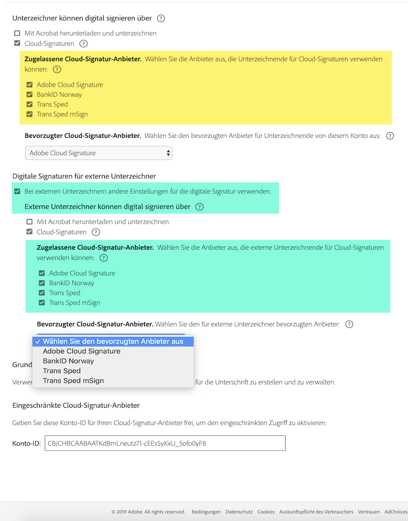 Acrobat Sign-Administratoren können verschiedene Cloud-Signatur-Anbieter für interne und externe Unterzeichner konfigurieren.