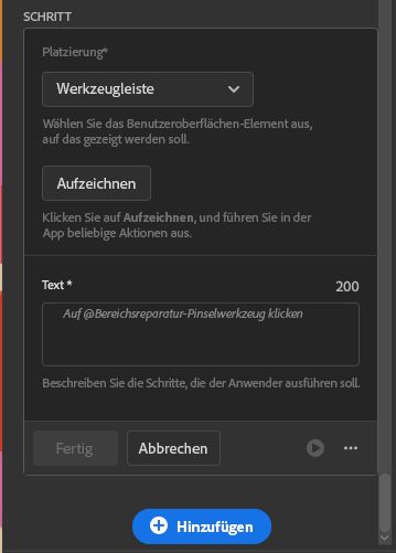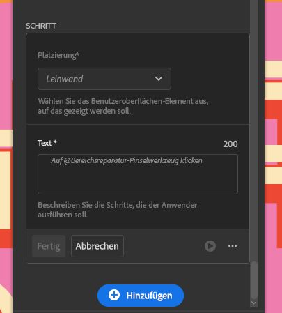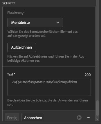 In der aktuellen Version von Tutorial Builder können Hinweismarken nur bei 2 Schrittarten (Menüleiste und Werkzeugleiste) durch Aufzeichnen erstellt werden. Hinweismarken für Leinwand (die Arbeitsfläche) und Bedienfelder können mithilfe von Dropdown-Menüs und eigenem Text erstellt werden.