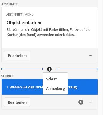 • Sobald du deinen ersten Abschnitt und Schritt erstellt hast, kannst du weitere Schritte und Anmerkungen hinzufügen. Setze dazu den Cursor auf den Bereich zwischen einem Abschnitt und Schritt oder einem Schritt und einer Anmerkung, und klicke auf das Pluszeichen