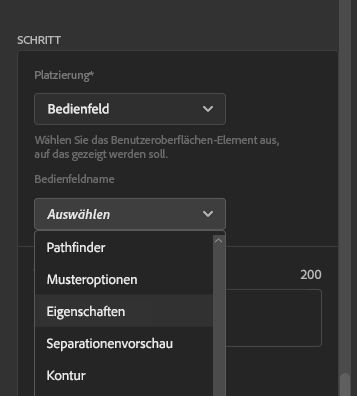 Bedienfeldnamen, die du nach Eingabe von „@“ auswählst, werden im Feld „Text“ in geschweiften Klammern dargestellt, z. B. „{adobepropertiespanelpanel}“ für das Bedienfeld „Eigenschaften“ (Properties). Aber: Im Tutorial wird nur der Name des Bedienfelds angezeigt und gefettet. Das Wort „Bedienfeld“ musst du selbst hinzufügen.