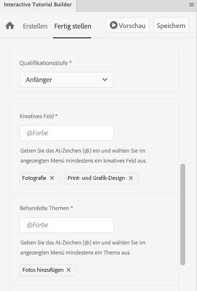 • Thema-Tags weisen auf das allgemeine Ziel oder den Inhalt deines Tutorials hin.